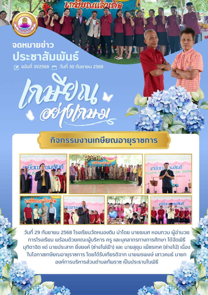 เมื่อวันที่ 29 กันยายน 2568 โรงเรียนวัดหนองติม นำโดย นายธเนศ หอมทวน ผู้อำนวยการโรงเรียน และ นางกฤติยาณี เฉวียงวงค์ รองผู้อำนวยการโรงเรียน พร้อมด้วยคณะครูและบุคลากรทางการศึกษา ได้จัดพิธีมุทิตาจิต เนื่องในโอกาสเกษียณอายุราชการ เพื่อแสดงความกตัญญูกตเวทีและความระลึกถึงคุณงามความดีแด่